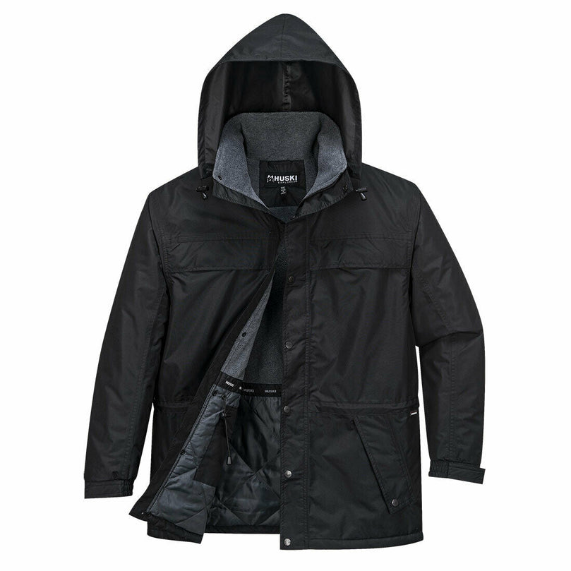 Long line jacket with polar fleece lining, concealed hood and embroidery access