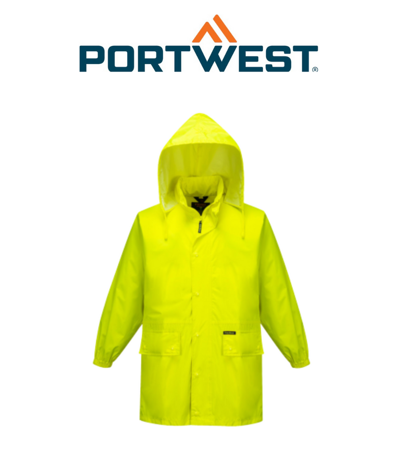 Hi-Vis polyester Waterproof Jacket and Pant Suit. Mid Length Lightweight Waterproof Jacket with waterproof hood, mesh lining, plastic zipper closure with plastic button snaps, deep waist pockets with plastic snap closure. Oxford waterproof pull on pants with boot closure snaps and elastic waist and drawstring for wearer comfort. Packed in a bag, ready for use when the rain pours!